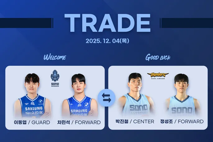 비선출 출신의 정성조가 고양 소노에서 서울 삼성으로 트레이드됐다. 소노는 정성조와 센터 박진철을 삼성으로 보내고, 가드 이동엽과 포워드 차민석을 영입하는 2대2 트레이드를 발표했다. 이번 트레이드는 서로 필요한 포지션을 보완하기 위한 결정으로, 정성조는 지난 시즌 평균 3.4득점을 기록하며 가능성을 보였다. 삼성은 그의 슛감이 잘 발휘될 것이라 기대하고 있다. 이동엽과 차민석 역시 각 팀에서 중요한 역할을 할 것으로 전망된다.