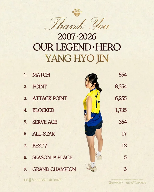 여자 프로배구의 스타 양효진(현대건설)이 이번 시즌을 끝으로 은퇴한다. 양효진은 19년 간의 선수 생활을 마치며, 현대건설은 그의 등번호 14번을 영구 결번하기로 했다. 2007년에 데뷔한 그는 리그 통산 득점 1위, 블로킹 1위 등 많은 신기록을 세웠고, 국가대표로도 2020 도쿄 올림픽 4강과 여러 아시안게임에서의 성과를 거뒀다. 그는 팬들과 동료, 코칭스태프에게 감사의 뜻을 전하며 남은 시즌 최선을 다하겠다고 밝혔다. 현대건설은 그의 업적을 기리고 은퇴식을 준비 중이다.